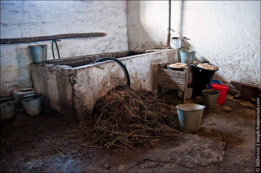 «Здесь почти ничего не изменилось с дореволюционных времен, лишь внутри периодически немного подправляли. Стойла новые, что-то по мелочи. Вот, смотрите, перекрытие в манеже — оно то самое, старинное. Полностью деревянная конструкция, а стоит уже третью сотню лет, ее никто и никогда не чинил», — рассказывает и показывает мой провожатый, бывший работник местного совхоза, а ныне — сварщик-строитель Сергей Евгеньев.