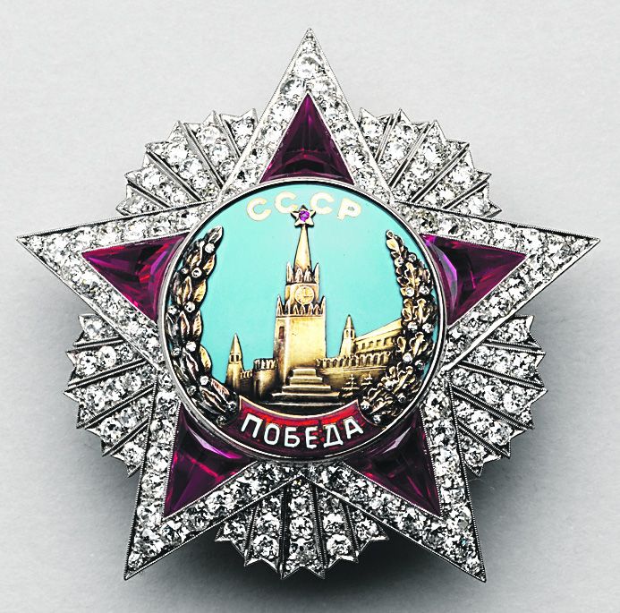 Вот легендарный орден «Победа»: высшая военная награда Советского Союза. Он был учрежден в 1943 году, когда произошел перелом в Великой Отечественной. Поначалу орден хотели назвать «За верность Родине», но затем по желанию Иосифа Сталина остановились на лаконичной «Победе». Над эскизом думали долго. В итоге отдали предпочтение пятиконечной звезде, в центре которой на голубом эмалевом фоне — изображение Спасской башни, кремлевской стены и Мавзолея. В работе использовали драгоценные материалы: золото, платину, рубины, бриллианты. Всего было изготовлено 20 орденов. Первым награжденным, а орден «Победа» получали лица высшего командного состава Красной Армии, стал маршал Георгий Жуков. На выставке представлены восемь орденов Победы — уникальная коллекция Музеев Кремля. К сожалению, здесь нет награды Жукова, зато можно увидеть ордена маршалов Ивана Конева, Константина Рокоссовского, Федора Толбухина. А также два ордена «Победа» Сталина.