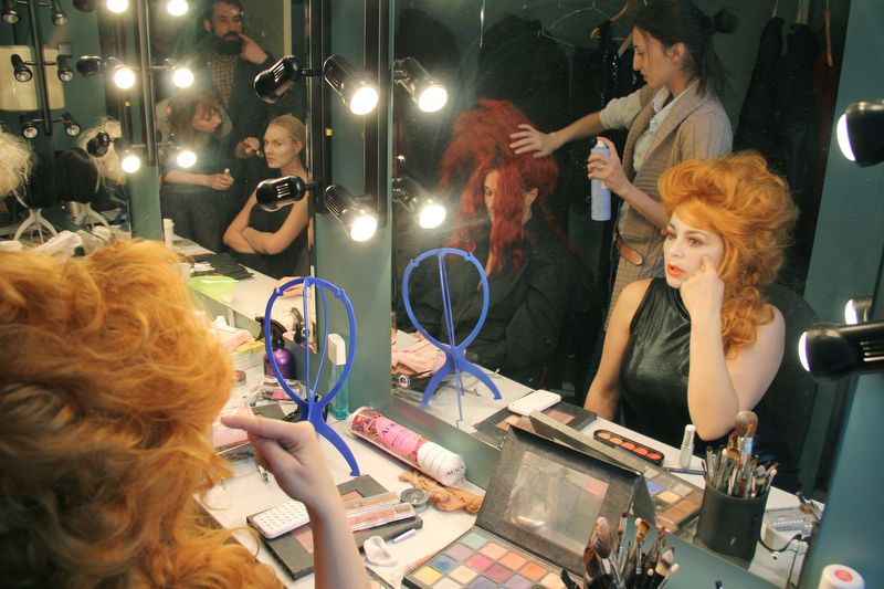 С началом спектакля для гримеров суета не завершается — «дежурство на спектакле» — процесс волнительный и ответственный. «Конечно, мы должны быть рядом с актерами, — считает Елена, — промокнуть лицо, чтобы не «потекли» глаза, припудрить заблестевший лоб, приходится поправлять усы, локоны, парики. Делать это нужно быстро и ловко».