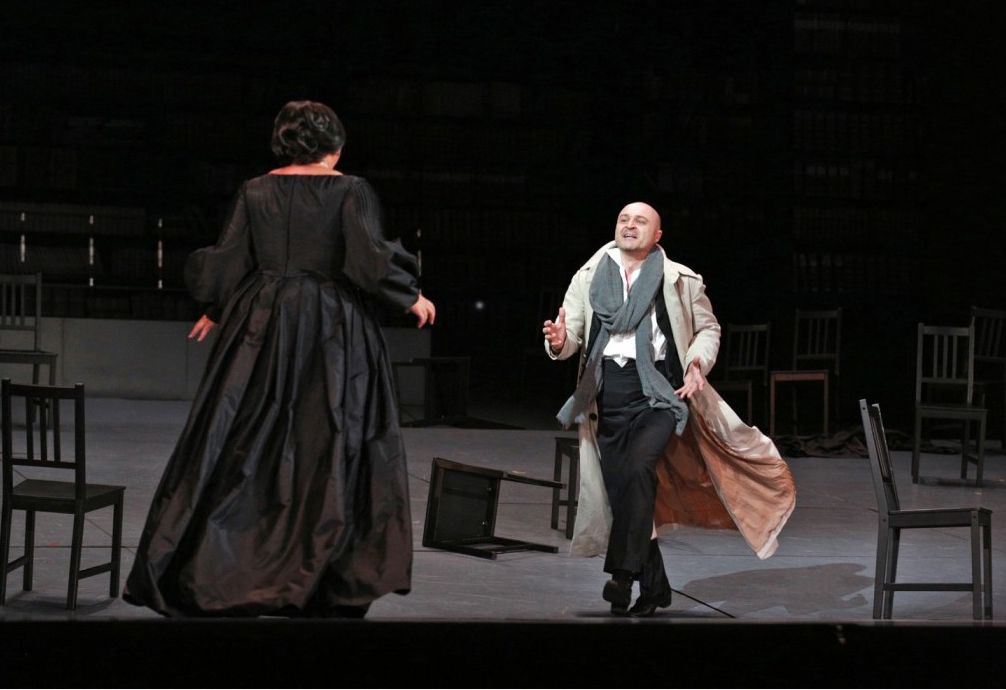 В помощь Жагарсу, конечно, пришлось хорошее соседство с художниками: Андрисом Фрейбергсом, создавшим минималистское, но оттого и предельно выразительное пространство, Кристине Пастернака, распределившей оттенки черно-белых своих костюмов так, что от одежд и нарядов заструилась дополнительная энергия смыслов, и Инетой Сипуновой, подхватившей своими видеопроекциями широкий формат сценографического образа.