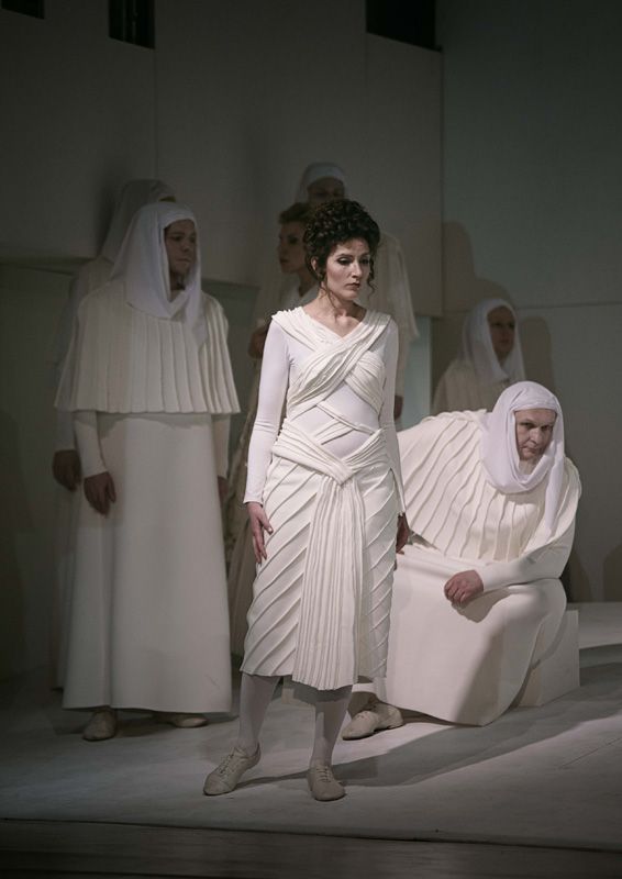 Режиссура Игоря Ушакова, принявшего спектакль на бегу, после вынужденного выхода из проекта бывшего главного режиссера театра Михаила Кислярова, скупа и не цветиста. Минимум движений, картинно застывшие позы героев — все это логично дополняет слепящую белизну, оставляя ощущение некоего стерильного, идеального и оттого неживого локуса. Словно ты — в музее, среди беломраморных античных статуй. Если свою предыдущую постановку о древнеримских временах — «Сервилию» Римского-Корсакова — Камерный делал максимально реалистичной, то моцартовский опус про приблизительно ту же эпоху подан предельно условно, обобщенно и схематично.