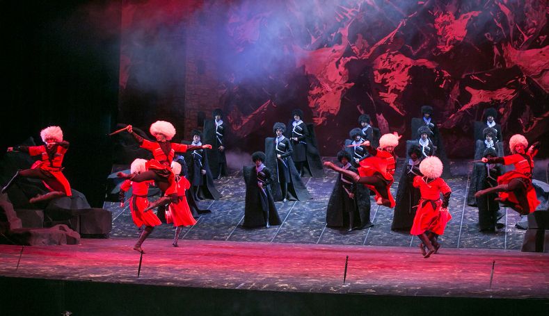 Роскошные горы Кавказа на заднике и на суперзанавесе (художник Анна Контек), колоритная лезгинка, врывающаяся на сцену в различных картинах (хореограф Сергей Бобров), аутентичные костюмы — красноярцы стараются представить забытую оперу во всей ее первозданной привлекательности. Подход, не вызывающий вопросов: чтобы интерпретировать произведение и, может быть, переосмыслить, дать в перспективе оригинальную версию, его не плохо бы для начала просто узнать — распробовать и понять. В предлагаемые обстоятельства абсолютно традиционной рамы эстонец Неэме Кунингас, ныне главный режиссер в Красноярском оперном, мастерски вписывает мизансцены, делает профессиональные разводки, выстраивает драматургию отношений героев, следуя за партитурой, — тут ни к чему не придерешься. Спектакль убеждает своей добротностью и визуальной притягательностью. Впрочем, без вмешательства в текст не обошлось: петербургский маэстро Владимир Рылов вместе с автором концепции и худруком театра Сергеем Бобровым подредактировали либретто, привнеся в пушкинский сюжет мотивы богатой российской истории Кавказа — от Лермонтова до Толстого. Ход тоже, в общем-то, уместный. В том числе и за счет этого постановка оказывается актуальной — ведь живы до сих пор темы любви и ненависти, дружбы и войн, соседства и поиска компромисса, сложных, но очень близких отношений между народами.