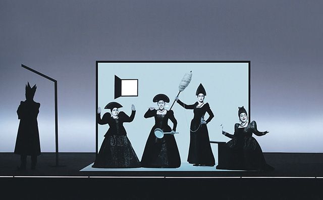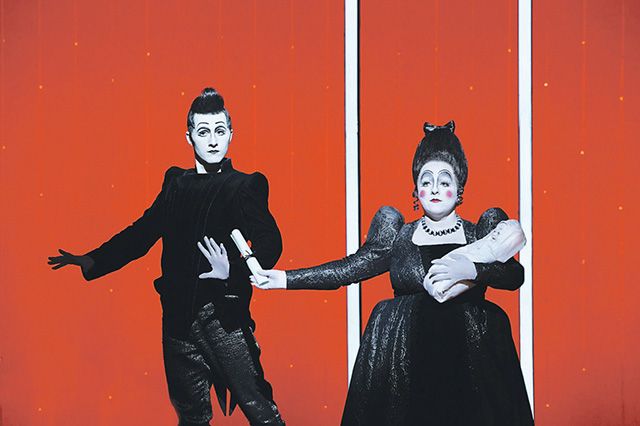 Искажение работает у Уилсона на преодоление штампов. Эмоциональные взаимосвязи между героями разрушены — они не смотрят друг на друга, но корчат гримасы публике, замирают в картинных позах и танцуют, словно механические куклы из заводной шкатулки. Все — по точному музыкальному сигналу. В драйвовой эклектике Уилсона аккумулируются традиции театров мира — от расписного грима в духе японского кабуки до семенящей, «механизированной» пластики европейских мимов. Условность преображается в великолепный герметичный мир, где текст теряет свое истинное предназначение: отдельные фразы и целые вокальные номера повторяются гипнотическими циклами. Девушки из американского дуэта «CocoRosie» сочинили к спектаклю харизматичную музыку, в которой нашлось место утонченности джаза и энергичности мюзикла. А у Театра Наций нашлось место для оркестровой ямы, куда посадили живой ансамбль.