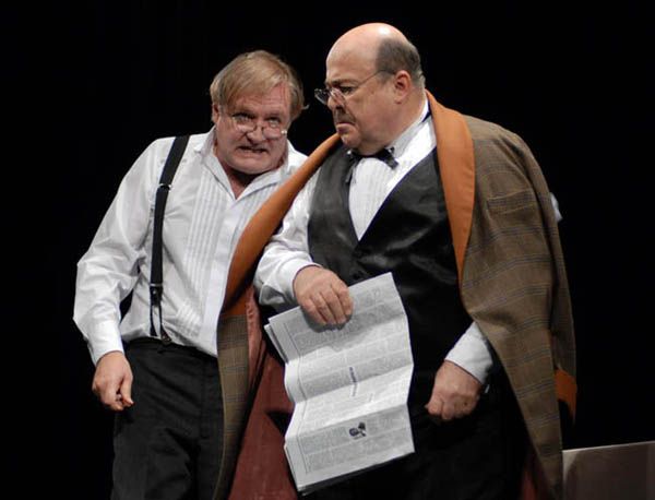 Постановка камерная: здесь нет декораций, лишь намек на автора — пенсне и бабочка, изображенные на заднике. На сцене два актера: народный артист России, служащий в вахтанговской труппе Владимир Симонов, и сам Александр Калягин. Разыгрываемые ими ситуации были придуманы Чеховым лет 130 назад, однако — возможно, из-за присутствия первого лица в зале — выглядели на удивление злободневными.