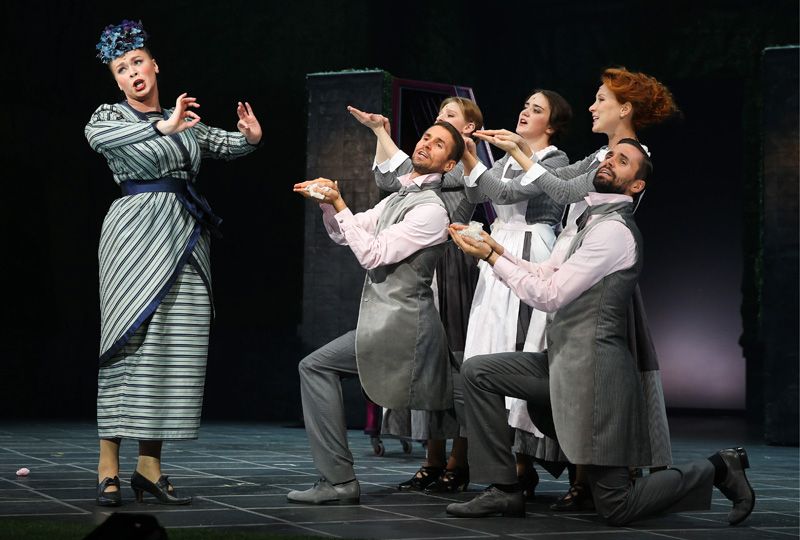 В МХТ получился спектакль весьма скромных достоинств — благоразумно развлекательный, скроенный по давно известным лекалам. Многое в нем вызывает стойкое дежавю. Складная и приятная музыка в добротном исполнении небольшого оркестра под управлением Армена Погосяна нередко звучит как цитатник и порождает желание поиграть в «Угадай мелодию». Как и ряд пластических и мизансценических построений. Когда пятерка дочерей, узнав о приезде богатого соседа, выкатывает портновские манекены с пышными платьями, вспоминается сцена из балета «Золушка», где мачеха и сестры собираются на королевский бал. «Спящей красавицей» явно навеян образ роковой Леди Кэтрин де Бург (Мария Зорина), появляющейся из-под земли, как черт из табакерки, и она — пластический двойник феи Карабос. А плутовка Китти Беннет (Мария Пестунова) взмахивает цветущей веткой, словно фея Сирени — волшебной палочкой.