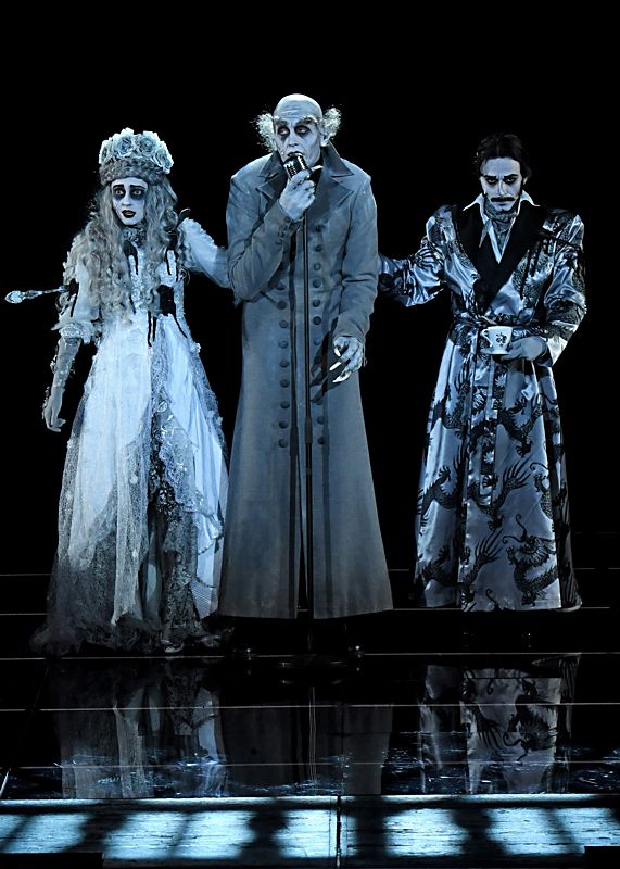 Глушков с соратниками по «Московскому королевскому театру» — есть в Первопрестольной и такой — художниками Вадимом Волей (придумавшим для спектакля изысканную «монохромную» сценографию) и Ольгой-Марией Тумаковой (сотворившей сногсшибательные костюмы) составили «колоду» самых востребованных, можно сказать «архетипичных» для мира театра, персонажей. Нашлось здесь место демиургу-сочинителю, извлекающему со дна чернильницы странные миры, что населены чудными персонажами (Чарльз Адамс — Мария Большова), юной, наивной и в меру строптивой героине (Луиза Адамс — Дарья Коныжева), злой мачехе, она же неверная жена (Аделаида — Полина Айрапетова), молодому герою-бунтарю (Франтишек — Николай Орловский), деспотичному отцу, в данном случае духовному (падре Кшиштоф — Анатолий Горячев), корыстолюбивому любовнику, готовому быть уютнее кота и безропотнее хомячка (Патрик — Дмитрий Рудков), невозмутимому блюстителю закона (констебль Монтгомери — Алексей Колубков). Добавили в эту компанию прелестное семейство призраков в составе неугомонного дедушки (Андрей Миххалев), его эстетствующего внука (Амбарцум Кабанян), любвеобильной внучки (Мария Большова) с пылким мужем (Юрий Буторин), двумя близняшками-очаровашками (Роза Шмуклер и Елена Ворончихина) и обаяхой гувернером (Игорь Войнаровский) в придачу.