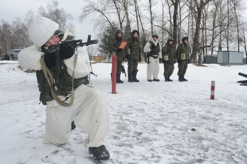 За танкодромом тренируются мотострелки. Призывники осваивают автомат Калашникова, ручной противотанковый гранатомет, пулемет ПКМ. Айджан Нормуханов, пулеметчик в маскировочном халате в тон снегу, садит очередями в цель на расстоянии 200–300 метров. Парень родом с Алтая. Когда в военкомате ему предложили служить в знаменитой Таманской дивизии, поначалу немного испугался — теперь привык и хочет даже остаться на службу по контракту.