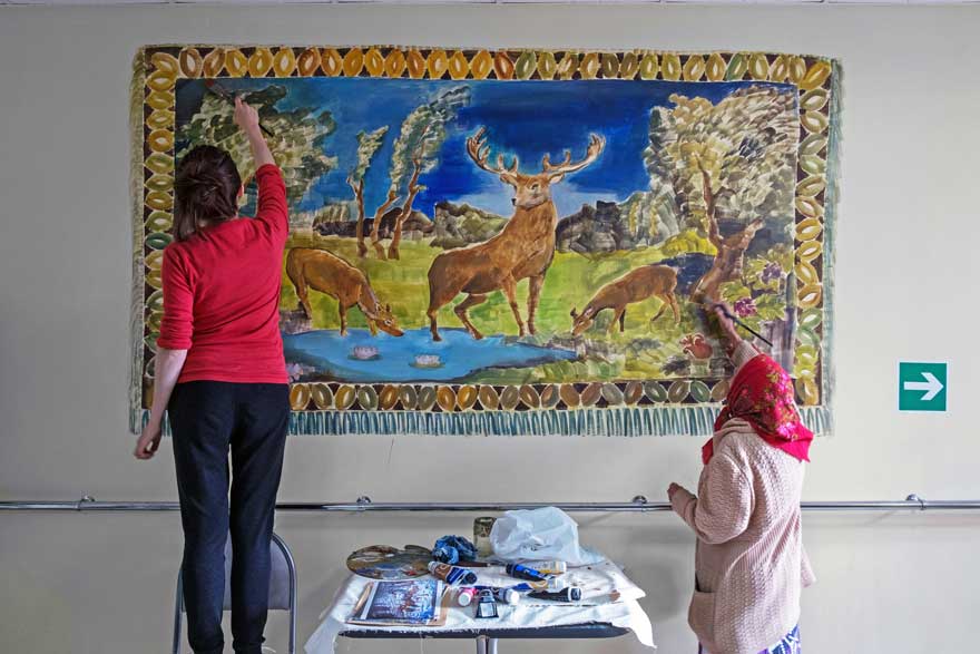 Бабушки с ее помощью расписали стены коврами с оленями — такие висели когда-то чуть ли не в каждой советской квартире, а теперь их и не достать. Катя предложила: «А давайте мы их нарисуем». Ковры получились как настоящие: когда все было готово, в Товарковском доме устроили вернисаж, и те, кто в росписи не участвовал, пытались их потрогать, не верили, что бахрома нарисованная.