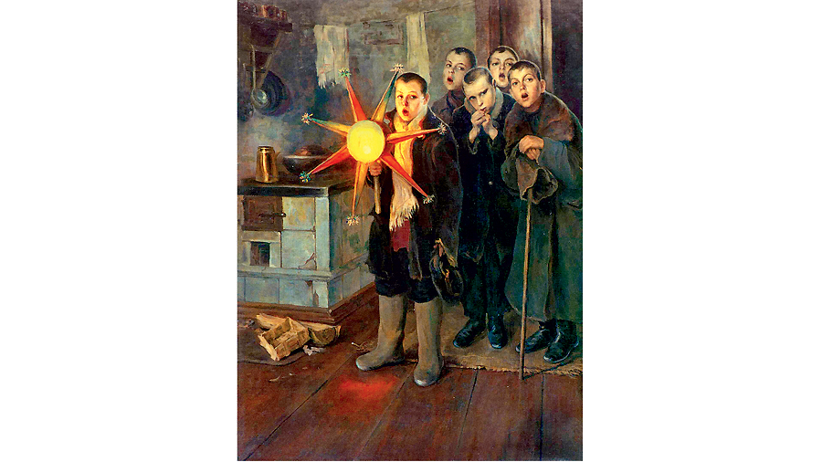 Обычно юные певчие приносили с собой самодельную Вифлеемскую звезду. Это можно увидеть на полотне Николая Пименко «Колядки» (вторая половина 1880-х) и, конечно, на многочисленных дореволюционных открытках. Детей щедро одаривали пирогами, калачами, баранками, а порой и деньгами.