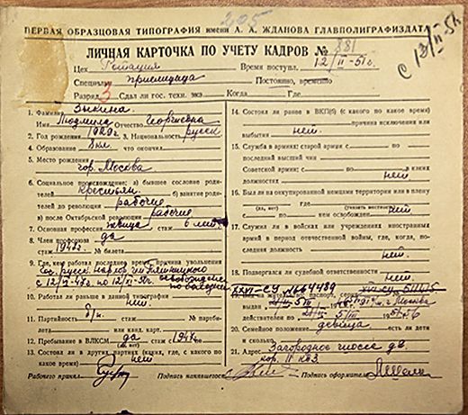 — Вот ее рабочая карточка, — показывает сотрудница отдела кадров Жанна Борисовна. — Уже бы и выбросить давно надо было. Никому не нужны эти старые бумаги. От типографии здесь теперь только управление, площади арендуют фирмы и компании. А наше производство все в регионах.