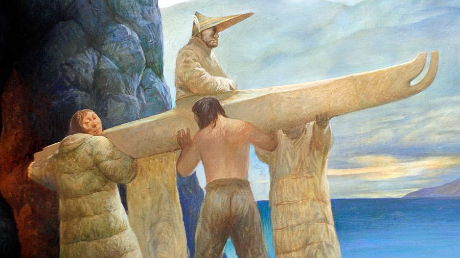 Художественная сторона выставки не так обширна, но предельно выразительна, а иногда даже познавательна. Например, из полотна Азата Миннекаева «Похороны вождя» можно узнать подробности алеутского погребального обряда. Для эскимосов, жителей Чукотки и полярных островов загробный мир расположен за морем, а потому отправляться в путь следует на каяке, в который и усаживают тело почившего, — художник два года провел среди туземцев и в точности его кисти можно не сомневаться.