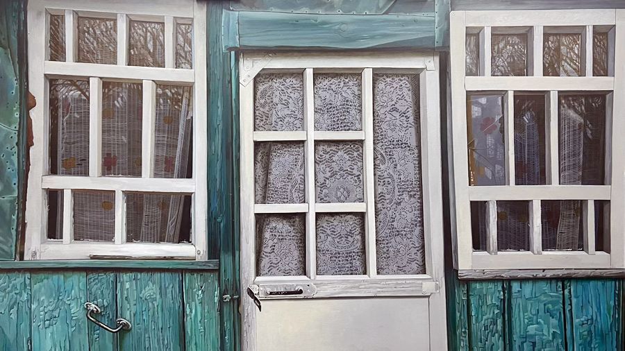 Сергей Казаков-Подкин, как и Семен Агроскин, обращается к теме воздухоплавания. Но его картина с советским лайнером («Домой») рассказывает о перемещении не только в пространстве, но и между эпохами. В универсуме Казакова-Подкина, как наверняка помнят зрители — а персоналка пермского художника прошла в Artstory в конце 2023 года, — путешествие приобретает символический смысл. Щемяще знакомый образ рисует картина Ивана Коршунова «Парадка» с окнами дачного дома. Там, за кружевными занавесками прячется ушедшая, оставшаяся лишь в памяти жизнь: шумных семейных сборищ, бабушкиных пирогов, ароматного чая и глупых мелочей, привезенных на дачу — чтоб выкинуть «когда-нибудь потом».