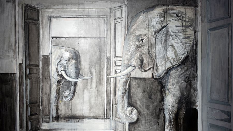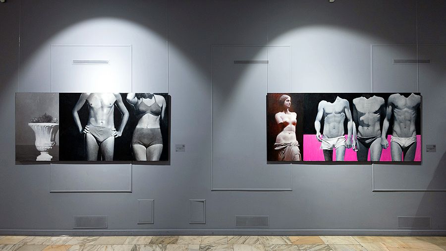 И, наконец, два малых зала. Один получился «белым», наполненным воспоминаниями, будто увиденными сквозь дымку времени — как в стихотворении Арсения Тарковского «Белый день»: «Камень лежит у жасмина. / Под этим камнем клад. / Отец стоит на дорожке. / Белый-белый день <...> Никогда я не был / Счастливей, чем тогда». Эту тему продолжают картины, на которых изображена анфилада комнат с тяжелыми резными дверями (Екатерина Рожкова), старый пруд (Иван Коршунов), блюдо с фруктами, выставленное в ожидании гостей (Ольга Менжилий).