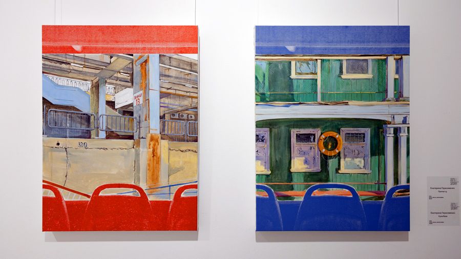 Коридор между залами являет собой лиминальное, переходное пространство. И темы здесь раскрываются соответствующие: отъезд, возвращение и трансформация человека, обогащенного новым опытом. Екатерина Герасименко изображает пустынный «Причал 13», словно увиденный пассажиром теплохода, удаляющегося от берега. А в работах Ксении Ефимовой пограничный образ воплощают заборы — бетонные, в шашечку, заполонившие постсоветское пространство.