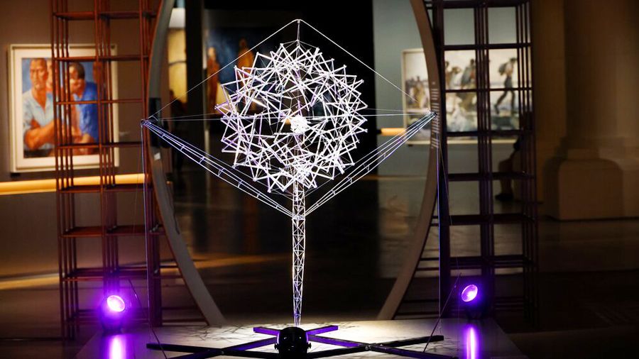 Но в «Зарядье» представлено не менее поразительное произведение — свето-кинетическая установка «Атом» (в модели 1:10). Гигантский ажурный шар, собранный из металлических трубок, был придуман в 1967 году молодым выпускником МАРХИ Вячеславом Колейчуком по заказу Института атомной энергии Академии наук СССР к 50-летию Октября. В его создании принимали участие специалисты Курчатовского института, а также легендарный Лев Термен, создатель терменвокса; благодаря ему композиция обрела уникальное звучание.