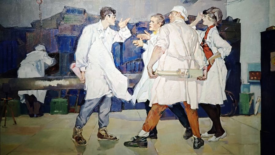 Советские физики 1960-х на картинах в «Паркинг Галерее» — это не «маршалы» и «генералы», а младшие научные сотрудники, лихие и незамысловатые, чем-то напоминающие иллюстрации к роману «Понедельник начинается в субботу» братьев Стругацких («Физики» Александра Дубовика, «Молодые ленинградские инженеры» Юрия Пенушкина, «Химики (В лаборатории)» Алексея Соколова — названия работ не блещут разнообразием). Но именно эти люди, по сути, ковали ядерный щит страны, испытывали технологии, которыми наши военные пользуются и по сей день. Радость созидания со временем сменилась пониманием того, что прорывы в науке и технологические достижения, созданные во благо человечества, теперь направлены против него. Однако ужас ядерной войны для советского искусства остался неотрефлексированным — наши художники (даже художники-нонконформисты) не создали работ, подобных «Атомной Леде» Сальвадора Дали...