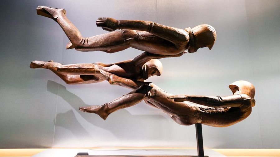Главную, на мой взгляд, картину экспозиции «спрятали» в самом конце «Паркинг Галереи»: это «Люди будущего» Константина Юона, работа 1929 года. Группа молодых атлетов, преодолевая силу земного притяжения при помощи странных летательных аппаратов, взмывают вверх, рассекают пространство, символизируя дерзкий порыв к неизведанному (как известно, Юон увлекался идеями «русского космизма», а поводом к написанию картины послужили впечатления художника от повести Циолковского «Вне Земли»). Они свободно парят в небе, как и их потомки — нынешние соседи по выставке — бронзовые космонавты Владимира Вахрамеева («Люди в космосе», 1972). Эти работы выглядят еще и как ожидание чего-то нового, может быть, новой главы в выставочном проекте ведущих российских музеев и ведущих российских госкорпораций. Продолжение последует?