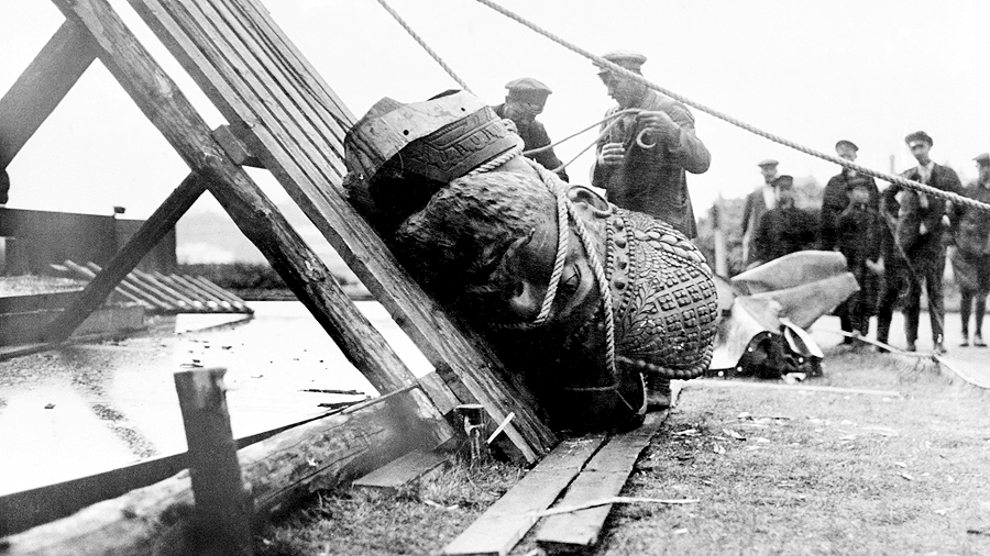 На снимках: фото памятника Минину и Пожарскому на Красной площади – Кирилла Зыкова/АГН «Москва»; памятник Минину и Пожарскому (в анонсе) – на старом месте, еще напротив мавзолея; Демьян Бедный; снос памятника императору Александру III у храма Христа Спасителя; разрушение храма Христа Спасителя