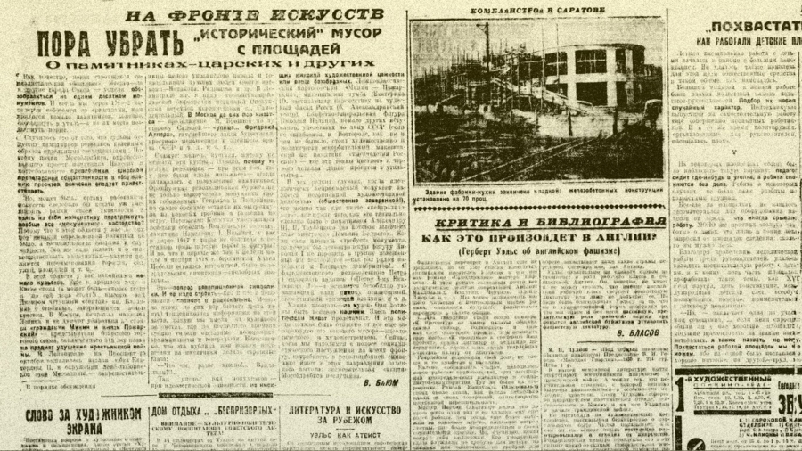 Начинался материал так: «Как известно, новая строящаяся социалистическая «большая» Москва, да и другие города Союза, успели обезобразиться не одним десятком монументов. И когда мы через 1/2-2 пятилетки соберемся со средствами, нам придется немало памятников, конечно, сковырнуть в утиль, а на их место воздвигнуть новые».