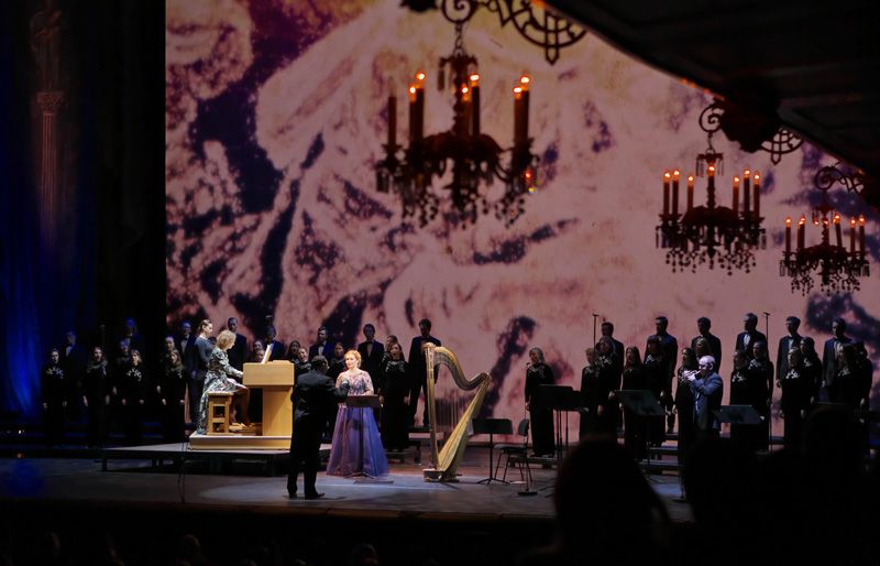 Божественный голос нисходит с небес в буквальном смысле слова: вся сложная конструкция органа с двумя тысячами труб размещена на специальной галерее в колосниках Основной сцены — ближе к квадриге Аполлона, чем к земле. Кафедра инструмента в обычные дни скрыта в оркестровой яме, но в день концерта ее, словно пророка Иоканаана из подземелья, поднимают на подмостки. И вот уже органисты один за другим укрощают педали и клавиши, извлекая самые невероятные звуки — то нежные и щемящие, то полнокровные и подавляющие мощью.