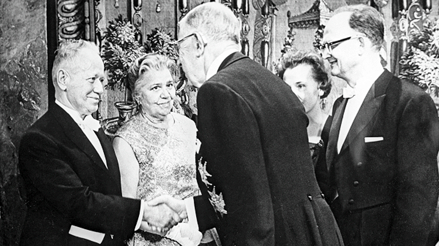 На фото РИА/Новости: Михаил Шолохов, его супруга и король Швеции Густав Адольф на вручении Нобелевской премии
