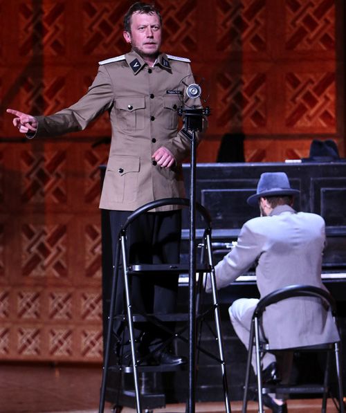 Самая интересная находка — многофункциональное пианино, вернее, клавишная установка, встроенная в корпус инструмента, стилизованного под старину. Оно не только издает звуки, но также используется как постамент, стол, диван для любовных утех, а в финале принимает вид жертвенника, на который укладывается все тот же юноша, но уже в окровавленной набедренной повязке. Прежде чем исчезнуть за подъехавшей стеной, он поднимается по ней и красноречиво застывает, раскинув руки в стороны. Прощание с иллюзией о вымышленном сыне представлено постановщиками как трагический и скорбный ритуал.