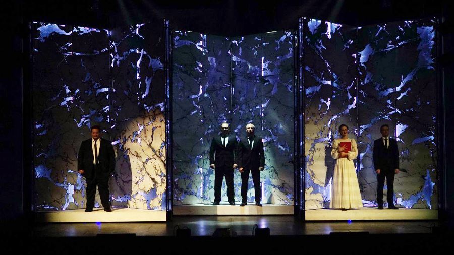 — Пространство сцены пугает: массивные декорационные «мраморные» перемещающиеся панели, освещенные разным цветом, меняют среду обитания героев и руководят нашими страхами...