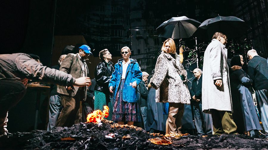 Вернемся на сцену. На правом переднем плане диван и ковер, обозначающие свежеполученную квартиру Зилова. Пришедшие на новоселье гости остроумно включают в экскурс по жилищу весь зрительный зал БДТ: художник по свету Игорь Фомин предписал на соответствующих репликах подачу света на балкон, еще раз на балкон, на люстру (какая красота!) и даже на лепнину с ангелами — вот как богато украшено 18-квадратное гнездышко зиловского семейства. Впрочем, никакого семейства нет: то жена Виктора Галина, то сам он катаются друг от друга на куске стены с батареей. Иногда, впрочем, и вместе — но это они заезжают в кафе, откуда Зилов все равно супругу старается выпроводить. Позади встроенный шкаф, куда главный герой пытается прятаться от всех и всего (тщетно). Совсем дальше, где-то на полпути к арьерсцене, расположено что-то вроде накопителя, откуда доносятся вокзальные объявления, потерявшие слова, несущие основную смысловую нагрузку (избитый прием). А еще в накопителе гнездятся товарищи пожилого возраста, которые в самые разные моменты выплескиваются наружу, сопровождая главного героя, вглядываясь в него и других. Их пепельно-серые и иссиня-черные облачения ясно говорят, что эти сущности уже отжили свое, они когда-то были отсюда, но физически их уже здесь нет. В программке они поименованы соседями, но мне кажется, что лучшая аналогия этим действующим лицам — Тени в «Божественной комедии», которые пытливо вопрошают путника: «…кто ты, адскою тропой/ Идущий мимо нас, живой и здравый!». Это, впрочем, не совсем точно: Зилов, конечно, пребывает в аду — но полумертвый и уж совсем не здоровый. Душа больна и, похоже, смертельно. Появляясь на сцене из задрипанного советского лифта, он обозревает постылое пространство и пытается сделать вид, что он здесь случайно, что просто перепутал этаж: «Это не мое! Это не мое!»
