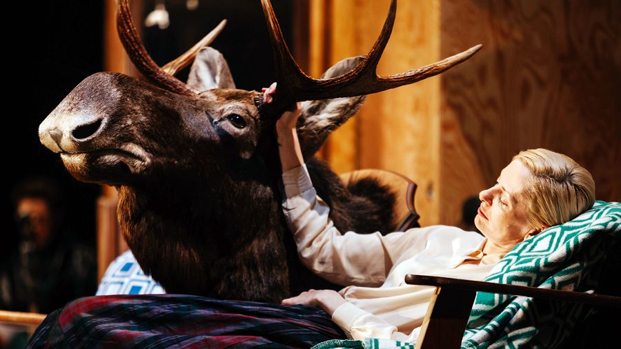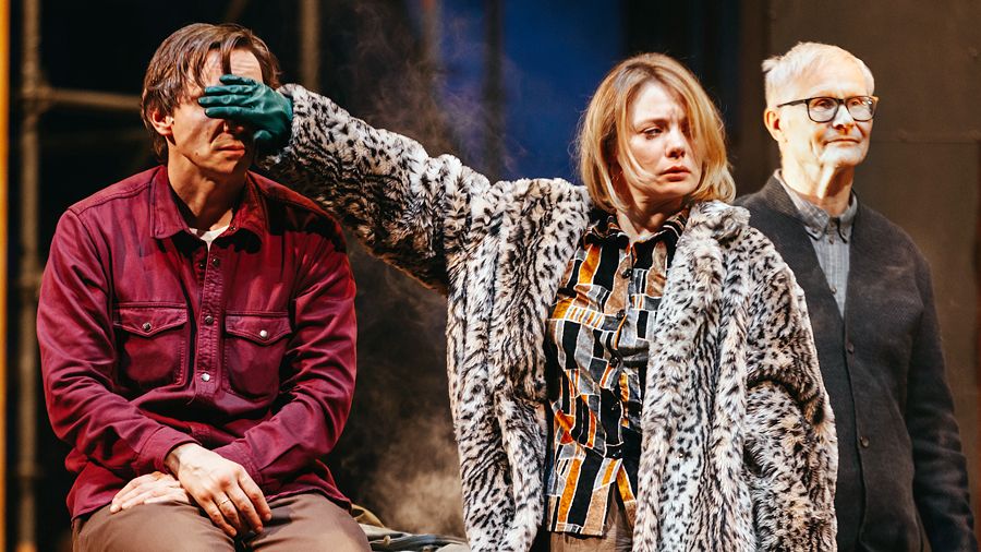 Звук сопровождает движение, экстатическая пластика. Вот Зилов, разметавшись чуть не на четверть авансцены, передразнивает жену, которая рассказывает ему про эпистолярный роман с другом детства. Сама Галина перемещается тоже диковинно, с перемежающейся хромотой. Отставленная любовница Вера (Карина Разумовская) так и вовсе бродит с полусвернутой шеей. По мне — снова некоторая избыточность декоративной косметики в игре.