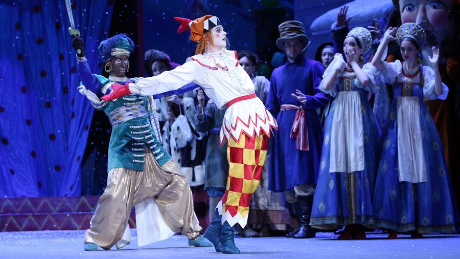 Кукольный любовный треугольник вполне убедителен. Особенно Петрушка в исполнении Даниила Потапцева — косолапый, угловатый, съежившийся, с мотающимися руками в рукавичках и внутренней болью, в нем — отсвет судеб униженных героев русской культуры. Хороша Балерина Анастасии Сташкевич — ветреная жеманница, семенящая механическими ножками. Свои чары она направляет на самовлюбленного болвана Арапа — Ратмир Джумалиев, танцовщик живых манер и легких прыжков, создает неожиданный образ ленивого самодовольства. После каждой сцены опускается занавес, на котором Бенуа изобразил картинку своих детских фантазий — над крышами уснувшего Петербурга пролетают почти гоголевские мифические химеры и всякая нечисть.