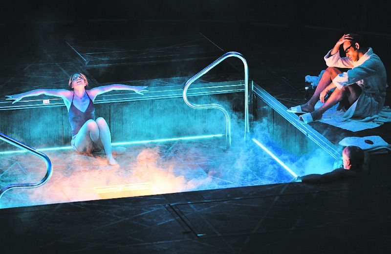 И вновь спектакль Ex Machina сам оказывается технически сложным механизмом. Небольшая круглая сцена таит множество люков и сюрпризов. Хитрые манипуляции превращают ее то в номер отеля, то в бар, казино или пустыню. Правда, актеров, появляющихся из-под подмостков, зритель по большей части видит только по колени или даже по пояс. И тем не менее зрелище это очень кинематографическое — без занавеса, с постоянной сменой планов.