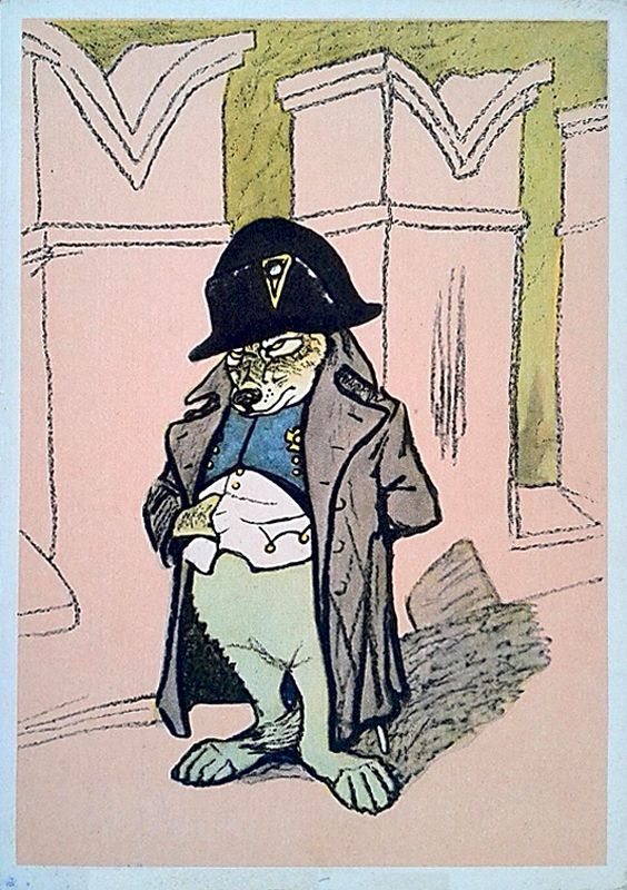 Напрасно хитрил Волк-Наполеон. Ловчий его поймал и сурово-назидательно молвил: «Ты сер, а я, приятель, сед, / И волчью вашу я давно натуру знаю; / А потому обычай мой: / С волками иначе не делать мировой, / Как снявши шкуру с них долой». / И тут же выпустил на Волка гончих стаю».