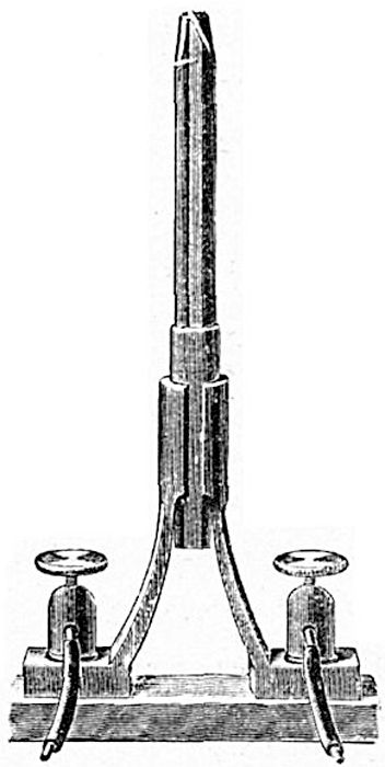«Русский свет», а светит и продается в Париже», — горько усмехался Яблочков, раскланиваясь с коммерсантами, интересовавшимися себестоимостью изделия. Сведения не секретные: всего-то двадцать копеек на русские деньги; два параллельных угольных стерженька, связанных тонкой металлической ниткой, а между ними каолиновый изолятор, испарявшийся по мере выгорания электродов. Подводишь ток от динамо-машины и полтора часа видишь яркое голубоватое свечение.
